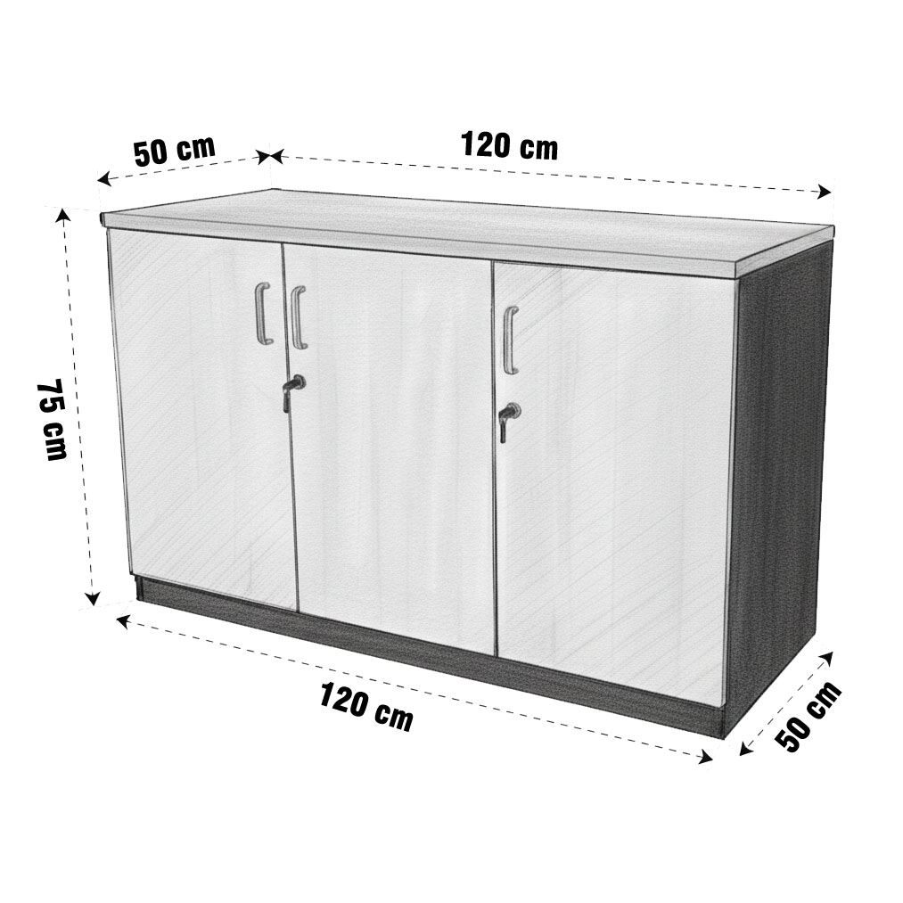 El MUEBLE BASE 3 PUERTAS EN CEREZO es una unidad de almacenamiento horizontal ejecutiva, diseñada para ofrecer una amplia capacidad de resguardo seguro y funcionar como apoyo o extensión de superficie. Su altura de 75 CM la alinea con la altura estándar de
