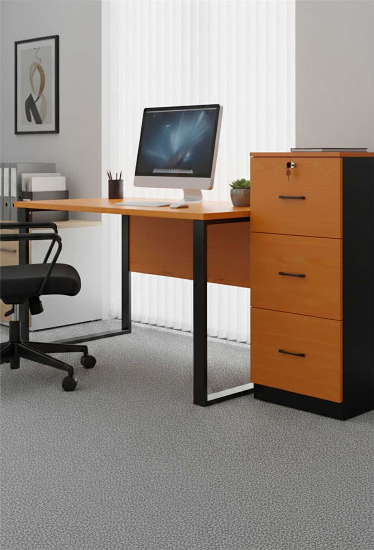 El diseño presenta el contraste ejecutivo entre el cálido laminado Peral en los frentes de los cajones y la estructura en color negro, garantizando la seguridad de los documentos gracias a su sistema de cerradura central.